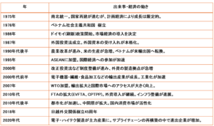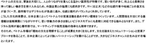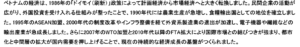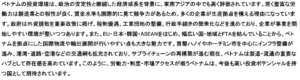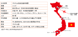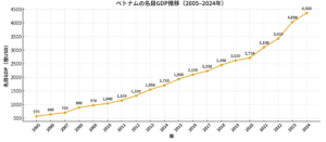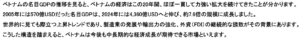 ベトナム基本情報 ベトナムの気候 ベトナムの地域別特徴 ベトナムの政治体制 ベトナム経済の歩み ベトナムの名目GPD(市場価格)について ベトナムの投資環境 ベトナムの文化 – 貿易データ – (貿易額) ・輸出: 4,059億ドル(うち対日輸出246億ドル) ・輸入: 3,809億ドル(うち対日輸入216億ドル) (主要貿易品目: 輸出) ①コンピュータ・電子製品・同部品 ②電話機・同部品 ③機械設備・同部品 (主要貿易品目: 輸入) ①コンピュータ・電子製品・同部品 ②機械設備・同部品 ③織布・生地 (主要貿易相手国) (1)輸出: ①米国 ②中国 ③韓国 (2)輸入: ①中国 ②韓国 ③台湾 ※ 参照元: ジェトロ 2024年データ